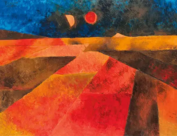 Parmi les œuvres emblématiques de Padamsee, on compte « Greek Landscape », qui illustre son utilisation unique des couleurs et des formes pour représenter des figures et des espaces de manière abstraite. Réalisé en 1960, ce tableau représente une période où l’artiste explorait les étendues et les terrains via des formes géométriques simplifiées. Ses « heads » ou portraits sont également célèbres pour leur introspection profonde et leur expressivité. Certaines de ses œuvres sont exposées dans des musées de renommée mondiale, y compris le Museum of Modern Art (MoMA) à New York.