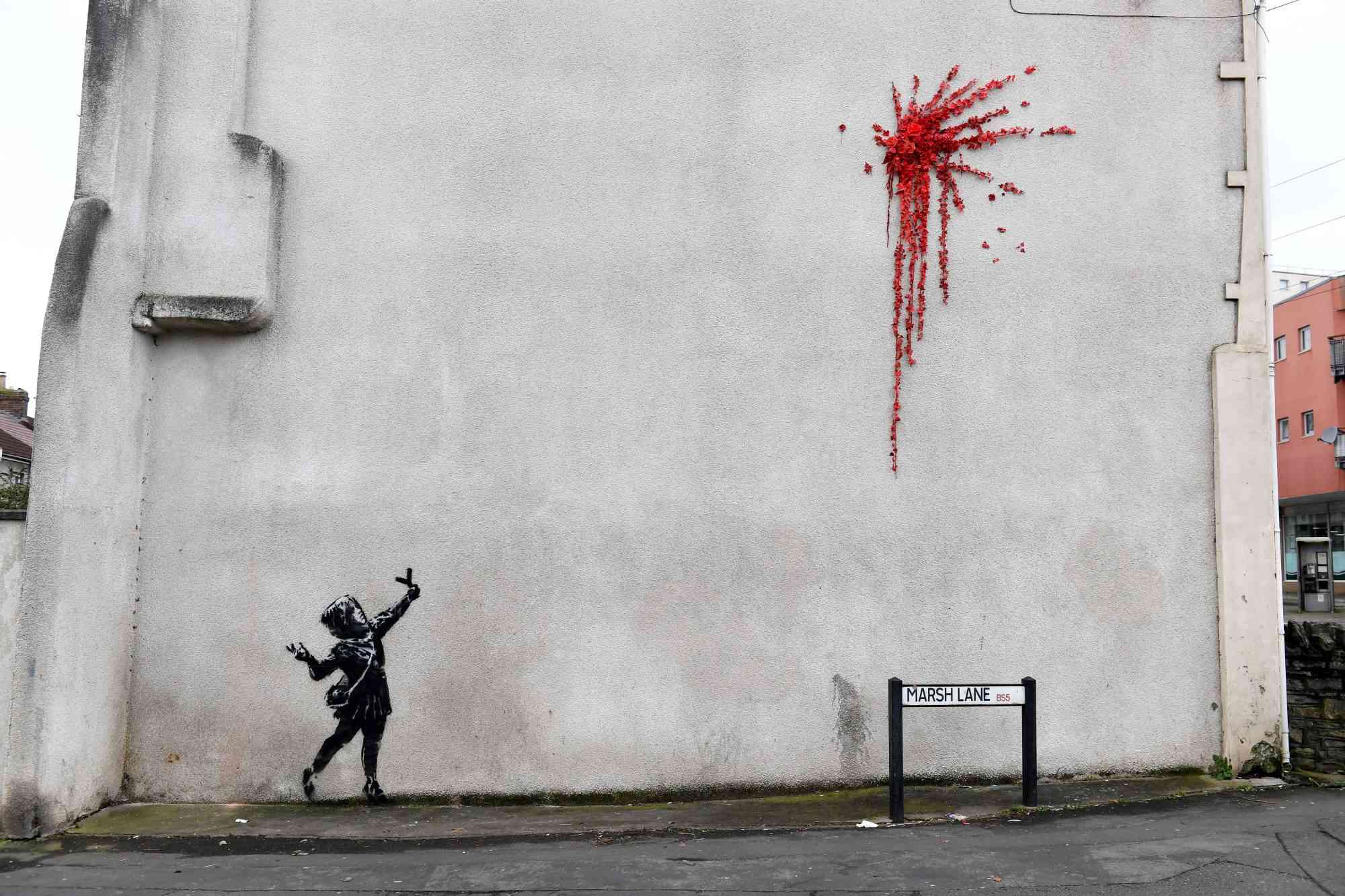 • « Love is in the Air » – Aussi connue sous le nom de « Flower Thrower », cette œuvre montre un manifestant lançant un bouquet de fleurs.