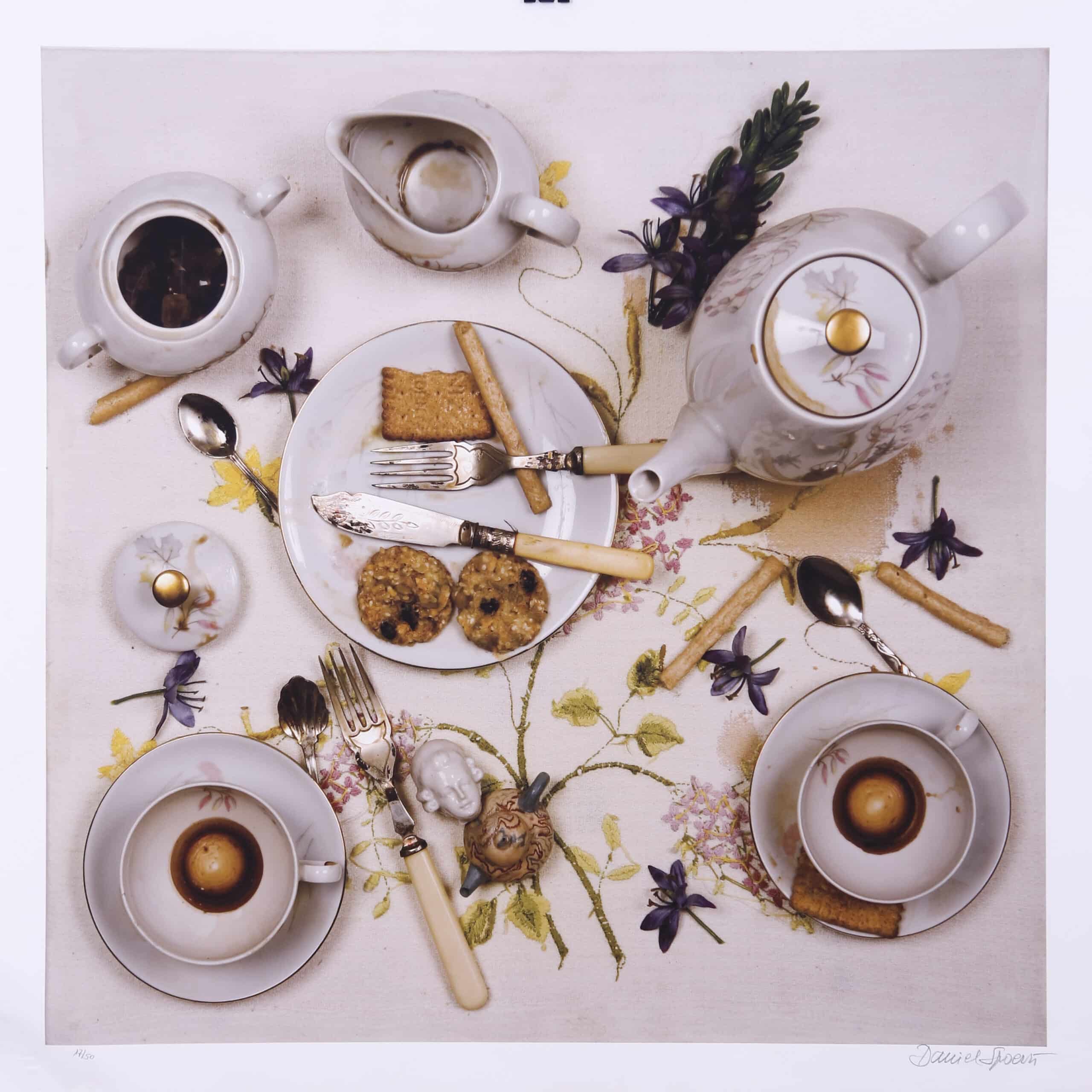 Spoerri était également intéressé par la nourriture en tant qu’élément artistique. Il a créé une série d’œuvres intitulée « Eat Art », qui consistait en des sculptures comestibles ou des performances gastronomiques. Cette série reflète son intérêt pour le passage du temps et la transformation, des thèmes récurrents dans son travail. Les œuvres « Eat Art » ont exploré la relation complexe entre la consommation, la mémoire et l’art.