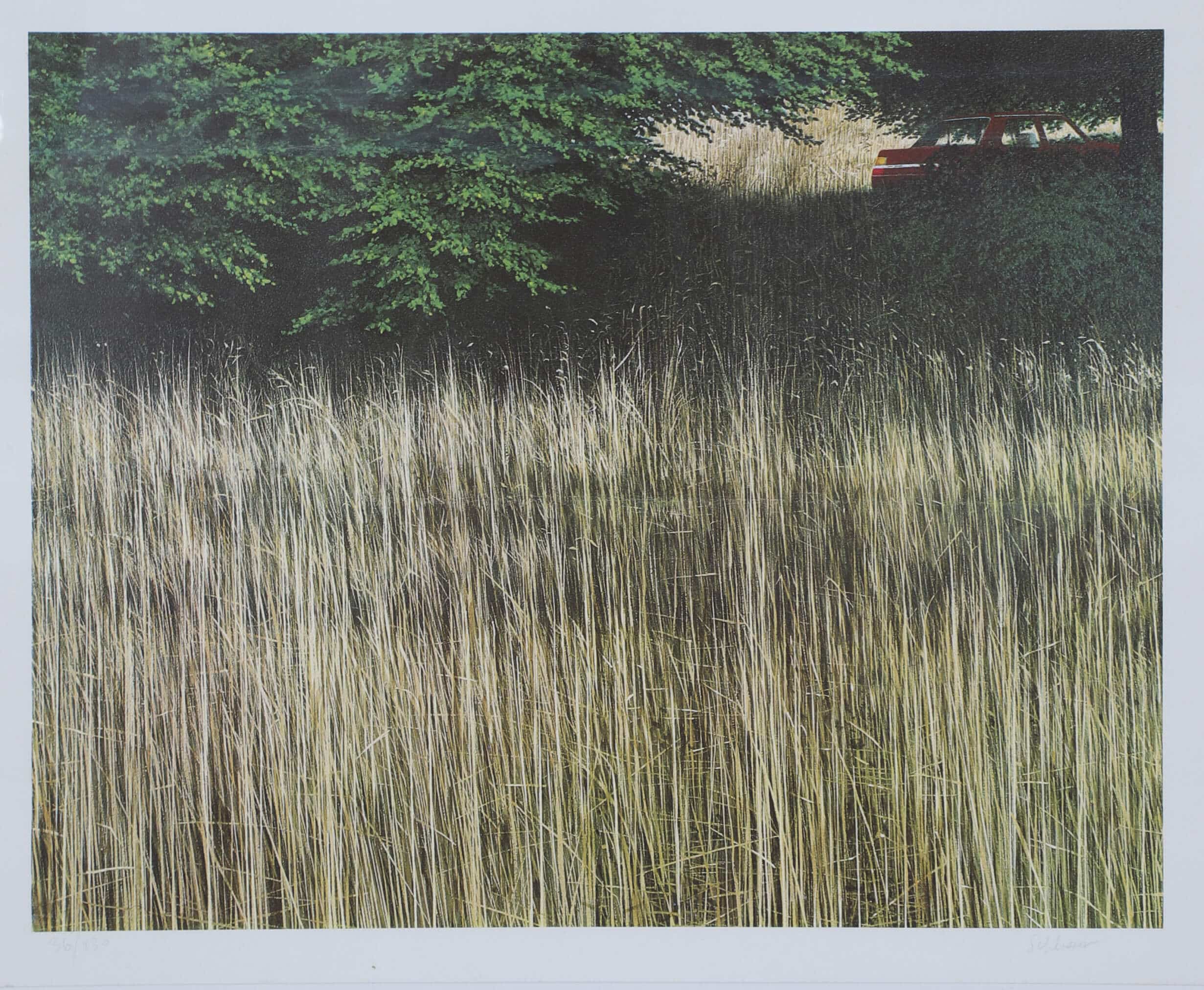 A partir de 1967, Schlosser décide de mélanger les pigments de sa peinture à des cristaux de sable. En apposant ce mélange spécial sur ses toiles, l’artiste parvient ainsi à leur donner une vibration particulière, permettant au spectateur de changer sa perception selon sa position ou son mouvement autour de l’œuvre. En 1970, ses recherches en figuration narrative le conduisent à expérimenter de nouveaux projets en ayant recours à la photographie ainsi qu’au photomontage. A l’instar d’un Jacques Monory, Gérard Schlosser intègre alors l’œil de la photographie au cœur de ses représentations, imposant à sa production un tournant vers l’hyperréalisme. Nourri par le cinéma, Gérard Schlosser n’hésite pas à faire de ses toiles des scènes à part entière, où chaque détail envoie un signe au spectateur et lui raconte une histoire. De la même manière, les titres qu’il donne à ses œuvres sont toujours significatifs, et contribuent à la compréhension de la composition, entrant parfois en décalage avec ce qui est montré par le peintre.