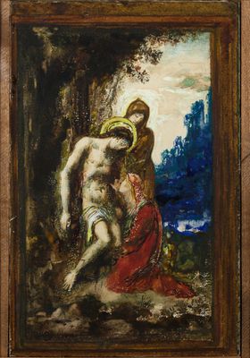 En 1844, il rejoint les bancs de l’atelier du peintre néoclassique Picot pour préparer son entrée à l’école des Beaux-Arts. Après deux années de formation, il intègre la prestigieuse institution, mais la quitte avec beaucoup de déception, ayant échoué à deux reprises au Prix de Rome ! Sa formation est donc académique, mais le jeune Gustave Moreau est attiré par ce qu’il ne connaît pas… Il entre en contact avec Eugène Delacroix, qui ne pourra pas le prendre dans son atelier, malgré toute sa bienveillance. Gustave Moreau fait de Delacroix son modèle, et retient de ce maître un goût pour les sujets orientalisants. Surtout, il rencontre le peintre romantique Théodore Chassériau, ancien élève d’Ingres, dont le style influence fortement ses premières productions. La première œuvre qu’il expose au Salon en 1852, une Pietà, ne laisse aucun doute quant à l’influence de Chassériau sur son élève et témoigne d’un lien certain entre les deux peintres.