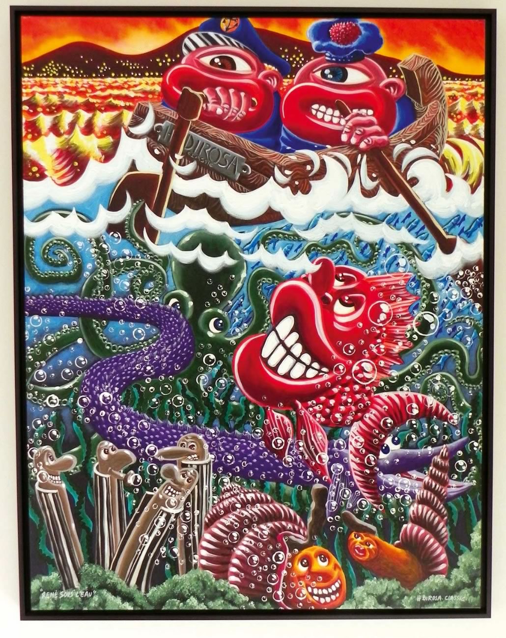 Les œuvres de Di Rosa se distinguent par leur style unique, avec des thèmes récurrents comme la culture populaire, l’humour et la critique sociale. Ses couleurs vives et ses compositions dynamiques sont également des signatures de son travail.