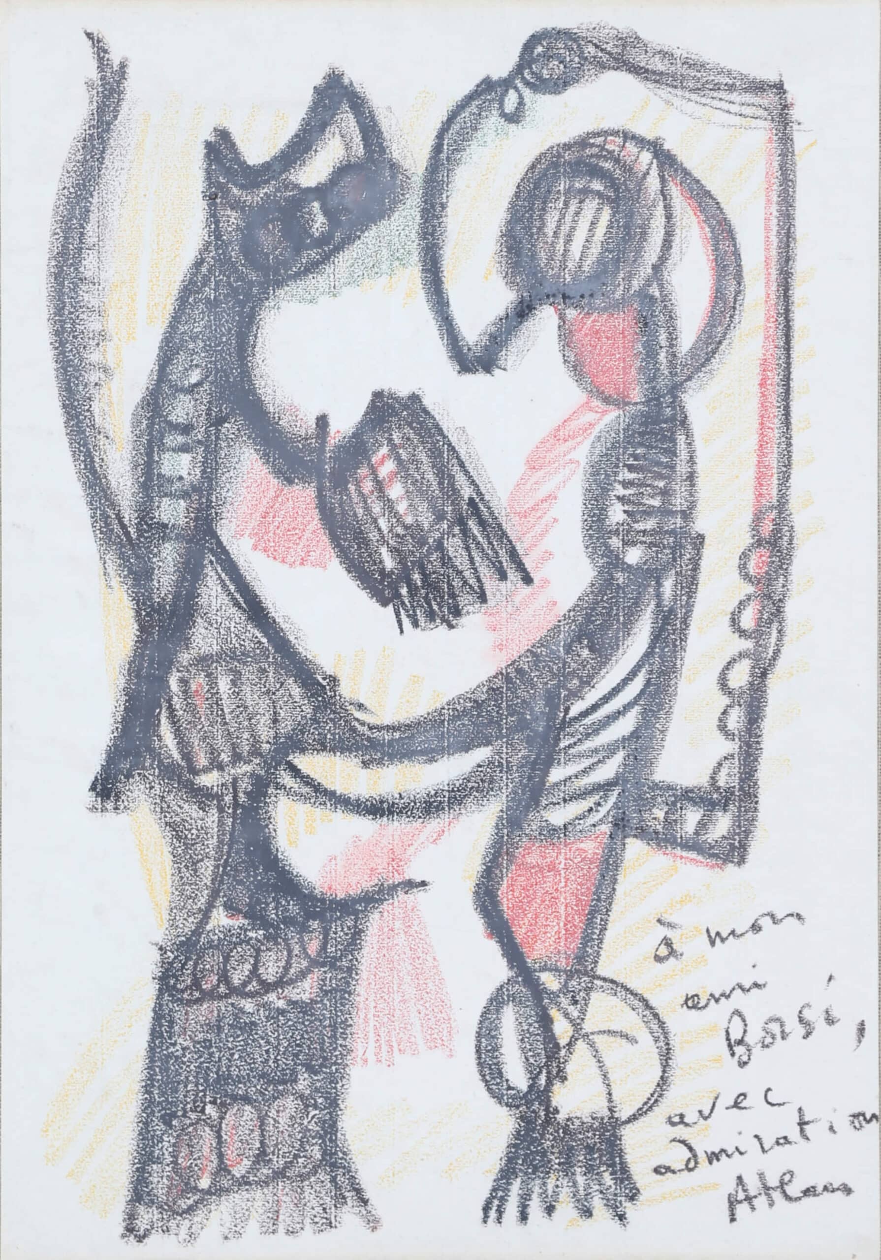 A partir de 1950, Atlan impose un tournant à sa production en s’orientant vers une stylisation plus forte des formes, contenant ainsi l’énergie première de ses toiles. C’est pour lui l’époque des hiéroglyphes, des signes ésotériques qu’il dessine en écho à d’anciennes formes, comme celles issues des arts africains et précolombiens. Malgré une incompréhension du public, ses toiles continuent à plaire ; aujourd’hui, Atlan est considéré comme une figure déterminante, non seulement de la politique des années 1930, mais aussi du paysage artistique de l’après Seconde Guerre mondiale et de la Nouvelle École de Paris. Il meurt en 1960 à Londres et vingt ans plus tard, le Centre Georges Pompidou lui consacre une importante rétrospective.