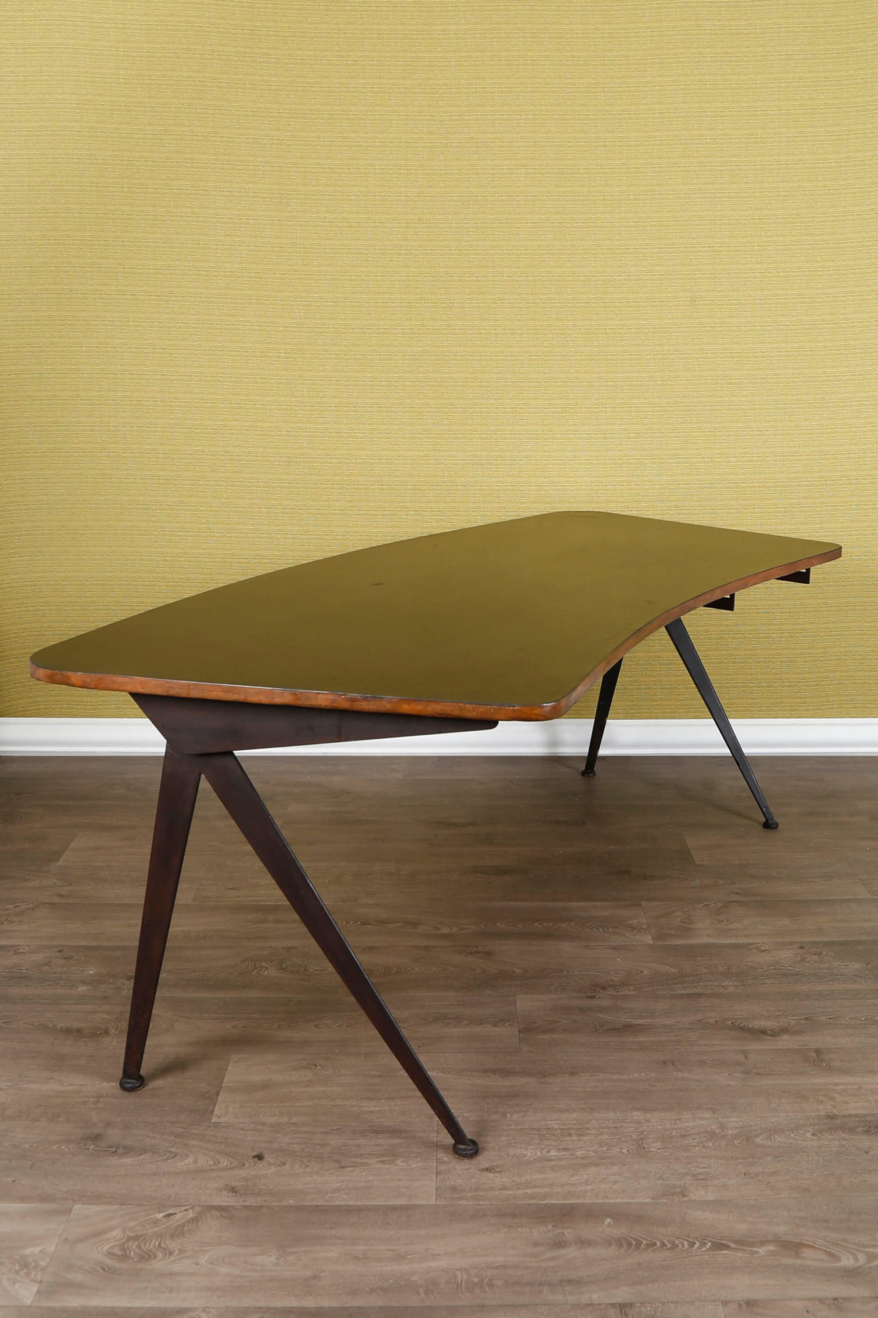 Artisan forgeron de formation et disciple d’Émile Robert, Jean Prouvé peut se targuer d’une connaissance profonde du métal et de ses diverses applications architecturales. Cette approche révolutionnaire, qu’il applique également au design en créant bureaux, chaises ou étagères, est à la base de son travail et l’a propulsé au premier rang des plus grands créateurs du XXe siècle. Au début de sa carrière, Jean Prouvé réalise portails d’entrée, escaliers, garde-corps, marquises… On le sait peu mais c’est à lui qu’on doit les grilles extérieures du Palais de la Porte Dorée à Paris, ancien musée des Colonies devenu Musée de l’Immigration, l’un des seuls bâtiments Art Déco de Paris. En 1924, Prouvé fonde son premier atelier de ferronnerie d’art et, la même année, dessine ses premiers meubles en tôle d’acier. Les effets de creux qu’il obtient grâce ce procédé confèrent non seulement à ses créations une esthétique reconnaissable entre mille mais encore ajoutent à la résistance et à la solidité de leur structure. Jean Prouvé réutilisera régulièrement ce métal dans ses meubles tout au long de sa longue carrière. A l’occasion, Prouvé s’est également intéressé à l’aluminium, en le pliant ou le moulant, sans jamais délaisser l’aspect esthétique de ses œuvres, primordial à ses yeux.