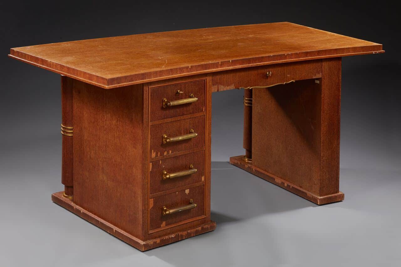 Parmi les réalisations les plus célèbres de Jules Leleu, on compte l’aménagement du paquebot Normandie en 1935 et celui de l’Hôtel George V. Ses œuvres se caractérisent par l’utilisation de matériaux luxueux comme le galuchat, la laque et les bois précieux. Leleu a souvent privilégié des formes épurées et élégantes, tout en intégrant des éléments de décoration raffinés qui reflètent l’élégance de l’Art déco.