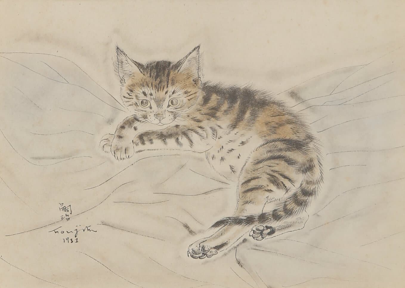 Foujita est surtout connu pour sa période du « Blanc et Noir », qui a débuté dans les années 1910. Il a développé une technique unique en utilisant de la peinture à l’encre de Chine blanche sur un fond noir, créant des images d’une grande pureté et d’une grande précision. Cette technique a renforcé son statut d’artiste novateur et lui a valu une reconnaissance internationale.