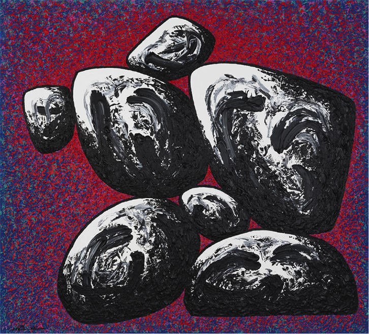 Parmi ses œuvres les plus célèbres, on retrouve ses séries de peintures et dessins de rochers, où il explore la relation entre la nature et la forme humaine. Utilisant principalement l’acrylique et l’encre, Ma Desheng joue avec les textures et les contrastes pour créer des compositions dynamiques. Ses œuvres sont présentes dans des collections prestigieuses comme le Centre Pompidou à Paris et le M+ Museum à Hong Kong.