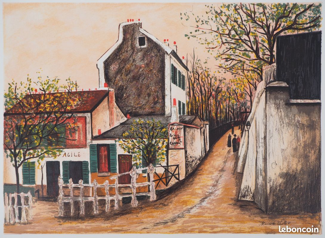 Ce qui rend Utrillo immédiatement reconnaissable est sa palette subtile et ses thèmes récurrents : des rues désertes, des églises, des cabarets, et des coins oubliés du Paris populaire. Sa signature mêle une dimension nostalgique à une rigueur presque architecturale dans la composition. Bien que les couleurs puissent varier, il reste fidèle à une esthétique épurée et mélancolique.