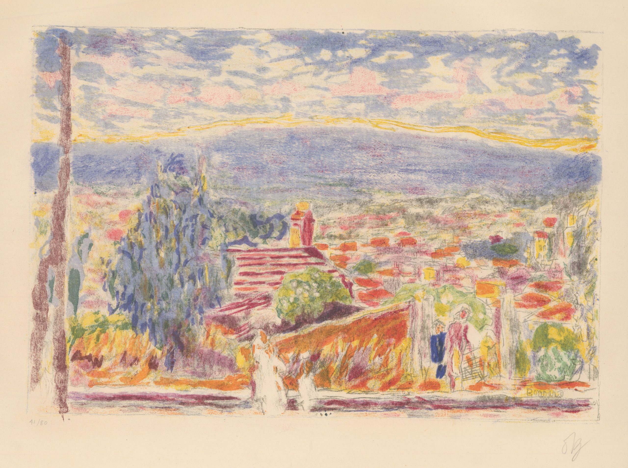 Séjournant entre Paris et le sud-est de la France, la peinture de Pierre Bonnard évolue vers un style très personnel. Le peintre affectionne tout particulièrement les compositions intimes, comme le prouve sa toile Le Déjeuner des Enfants conservée au Musée des Beaux-Arts de Nancy. Entre 1913 et 1915 cependant, Bonnard traverse une crise artistique, persuadé d’avoir trop sacrifié la forme au profit de la couleur et soucieux d’opérer un tournant dans sa création. C’est le début de ses grandes toiles inspirées des paysages de la Méditerranée. Il affectionne tellement cette région qu’il achète une propriété au Cannet quelques années plus tard, recevant collectionneurs internationaux et peintres, et particulièrement son ami Henri Matisse. A partir de la fin de la Première Guerre mondiale, sa renommée prend de l’ampleur et se diffuse à l’échelle internationale, comme en témoigne une première exposition particulière organisée à New York en 1928.