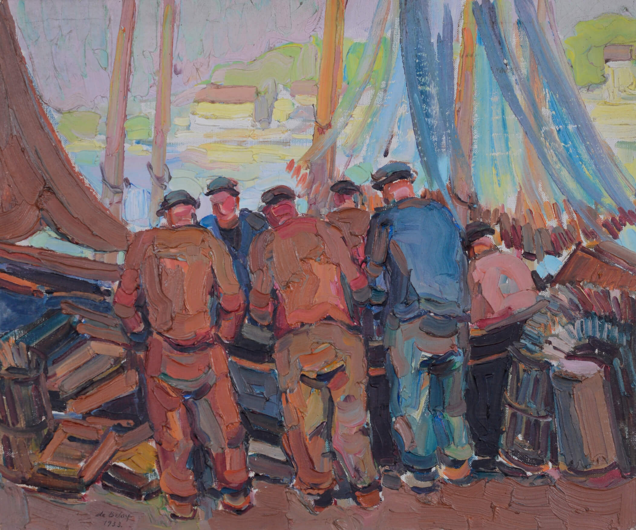 De 1923 à 1926, Pierre de Belay est l’illustrateur pour la revue Arlequin, qui couvre les événements artistiques de Paris et sa vie nocturne. Mais si Pierre de Belay épouse très tôt le mode de vie parisien et sait en représenter le tourbillon, il n’oublie jamais sa Bretagne natale qui représente plus de la moitié de son œuvre ! A partir de 1923, il rencontre un certain succès non pas grâce à ses toiles parisiennes mais grâce à des décors réalisés pour l’hôtel Kermoor à Bénodet, en Bretagne. Les cinq fresques, récemment mises en vente, représentent des scènes du quotidien breton, tout en témoignant des influences artistiques modernistes du peintre. C’est dans ce savant mélange entre nouvelles esthétique et vie locale que Pierre de Belay trouve sa propre voie d’expression. Et ce sont ces fresques qui lancent véritablement sa carrière, le poussant dès lors à multiplier les allers-retours entre la capitale et sa région natale. Chaque été, Pierre de Belay passe deux mois en Cornouailles.