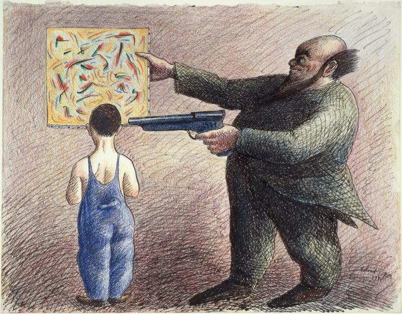 Roland Topor est souvent rattaché à un univers proche du surréalisme, bien que son engagement dans le mouvement Panique lui donne une place unique dans l’histoire de l’art contemporain. Refusant le conformisme, son art mêle l’esthétique du surréalisme avec l’immédiateté du dessin satirique, héritant des grands noms comme Salvador Dalí et Alfred Jarry. Dans une certaine mesure, son travail anticipe ou dialogue avec le courant du Pop Art, notamment dans son traitement sériel de l’absurde et des thèmes modernes. Il reste toutefois inclassable, se situant à la lisière des catégories classiques.