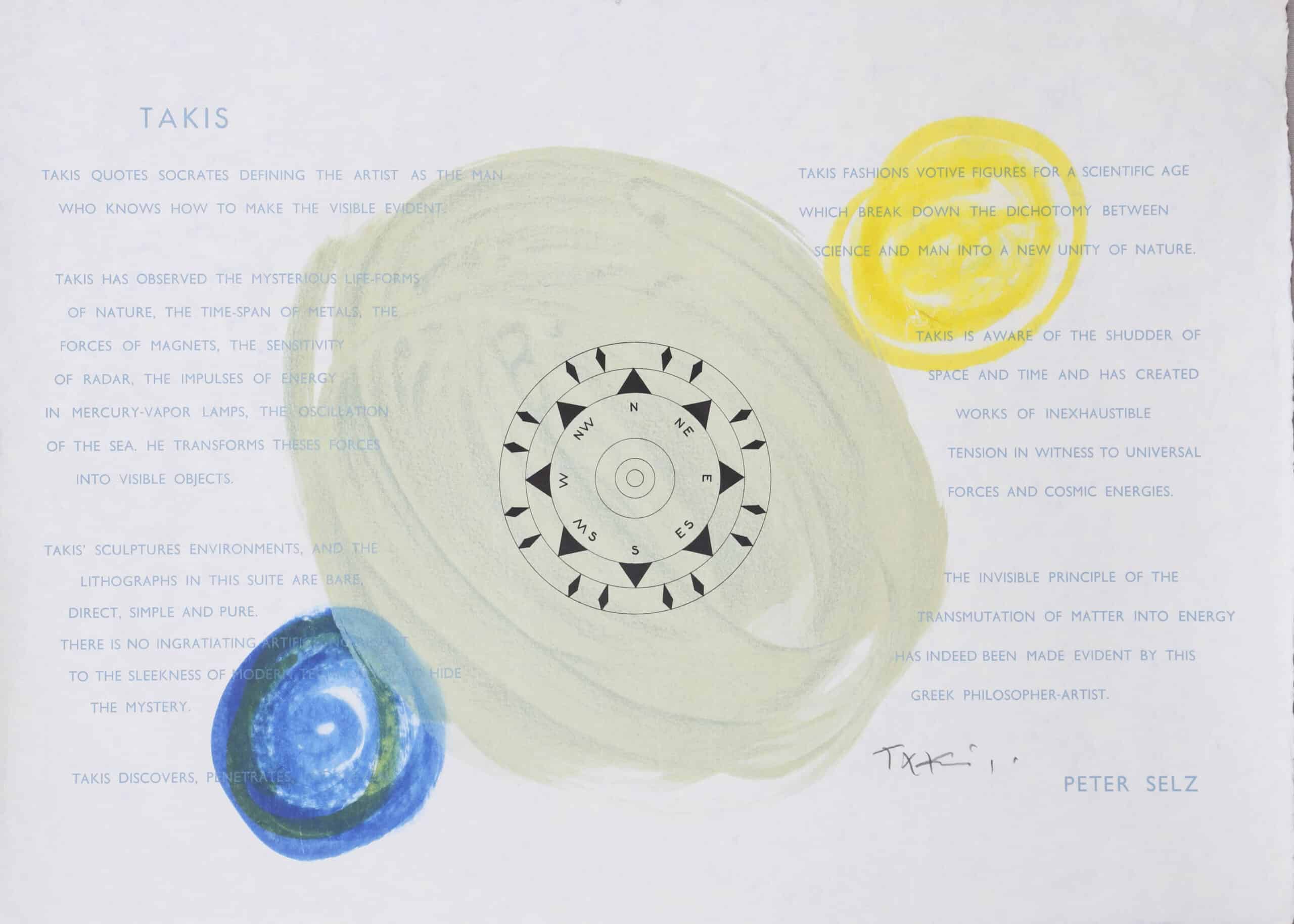 Takis s’illustre également par un appétit créateur débordant, en réalisant également des scénographies et des compositions musicales pour le théâtre au début des années 1960. Parallèlement, il écrit son autobiographie qui témoigne d’une enfance pauvre passée dans les rues d’Athènes et de son parcours d’autodidacte. De plus en plus, sa création se caractérise par le mouvement : en 1961, il présente les sculptures Télélumières, qui évoquent via l’utilisation d’électrons et d’ampoules dégageant une lumière bleue les dieux de l’Antiquité grecque. Sa création artistique, résolument tournée vers la science, lui vaut d’être surnommé par Marcel Duchamp le « gai laboureur des champs magnétiques et indicateur des chemins de fer doux ». A cette période, Takis a déjà acquis une renommée internationale, et inspiré beaucoup d’artistes, jusqu’aux poètes de la beat generation américaine !